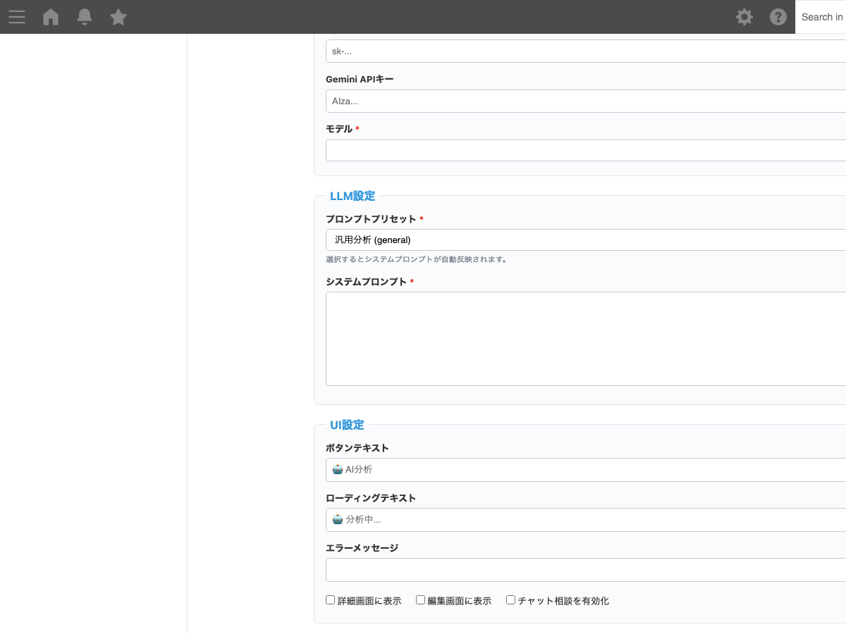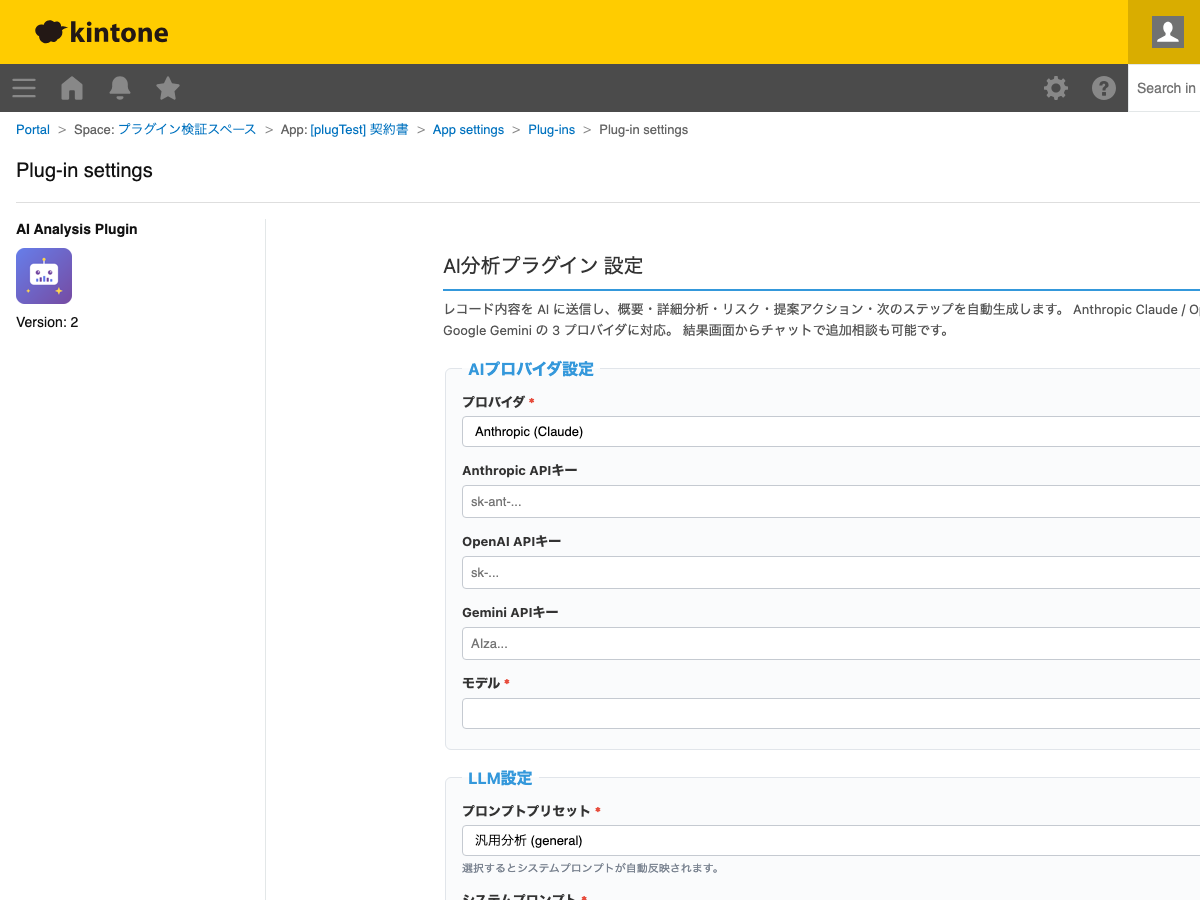 kintone レコードを hatena-service-hub の LLM プロキシ API 経由で AI 分析し、分析結果を指定フィールドに書き込むプラグインです。API キー管理を hub 側に集約し、安全・統一的な運用が可能。