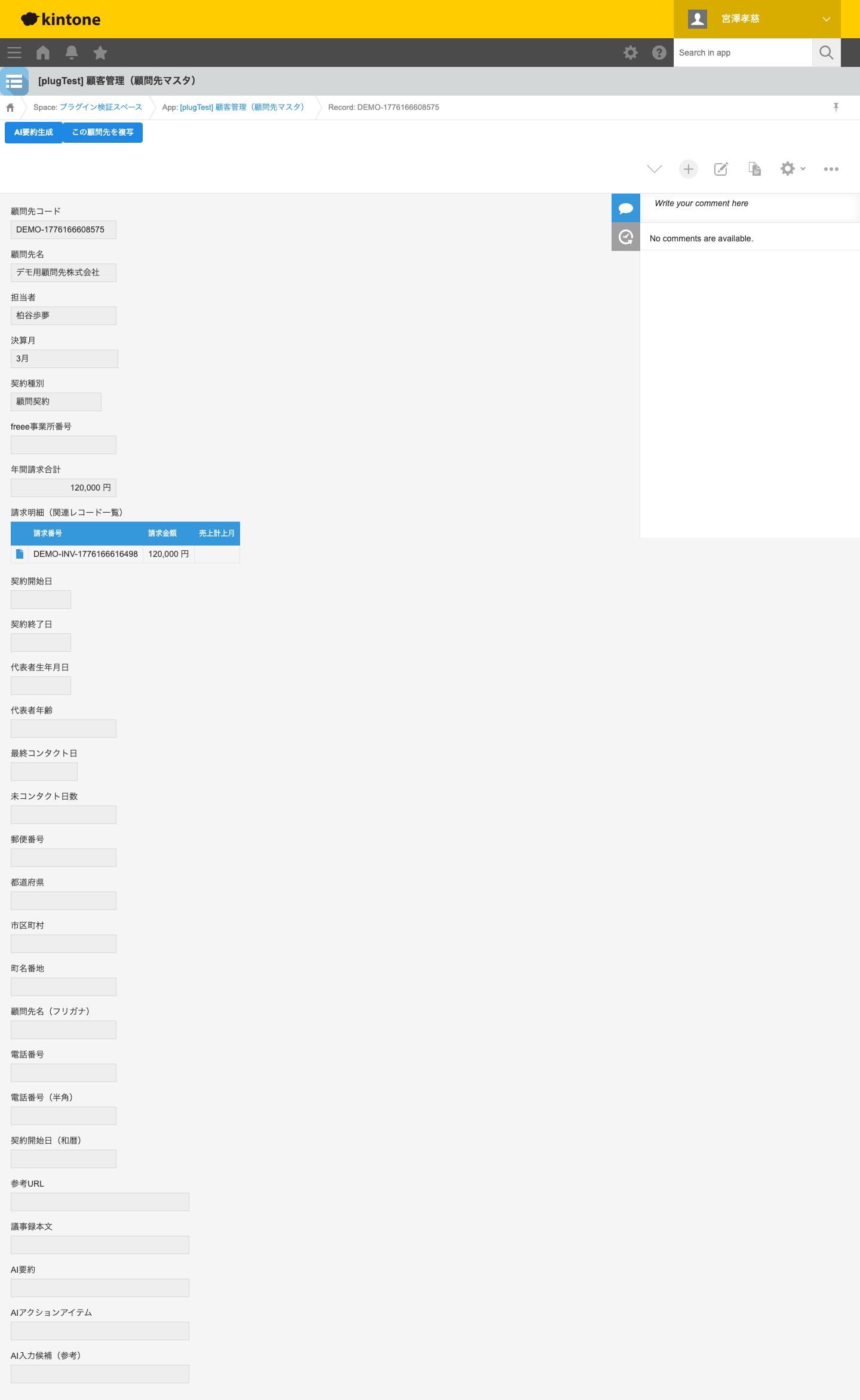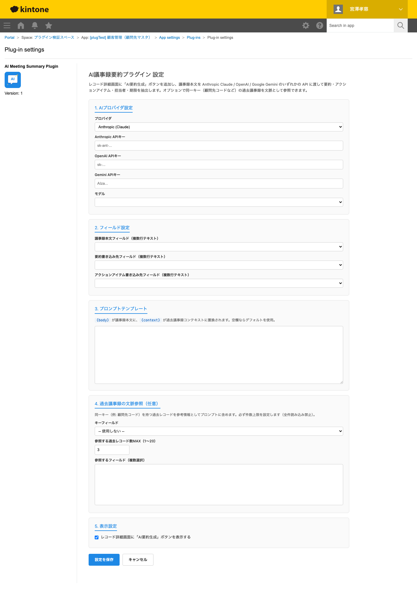 kintone のレコード詳細画面に「AI 要約生成」ボタンを追加し、議事録本文を Anthropic Claude / OpenAI / Google Gemini のいずれかの AI API に渡して要約・アクションアイテム・担当者・期限を抽出、別フィールドに自動で書き込みます。同一キー(顧問先コード等)の過去議事録を文脈として参照することで、継続案件の経緯を踏まえた要約が可能です。