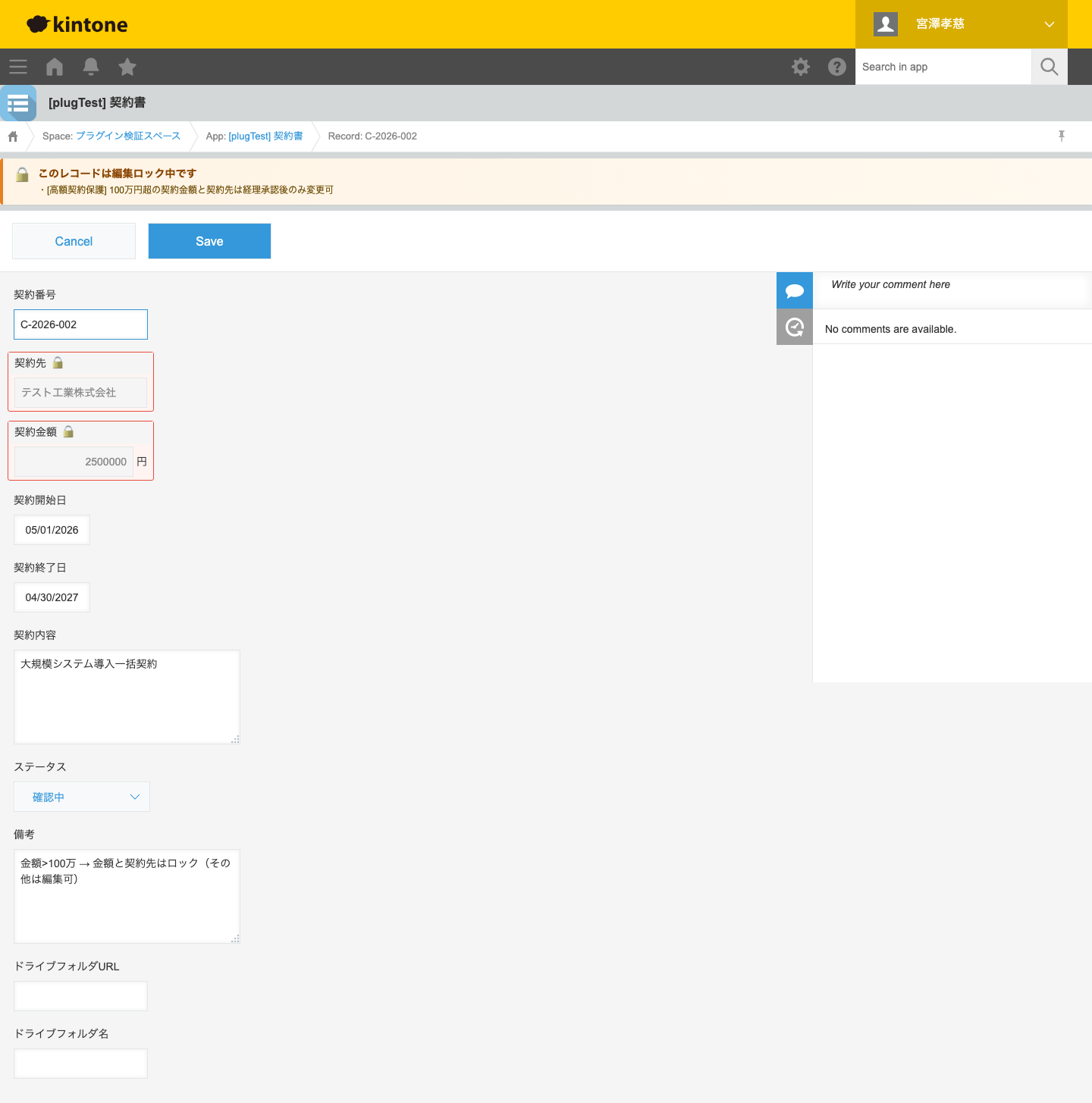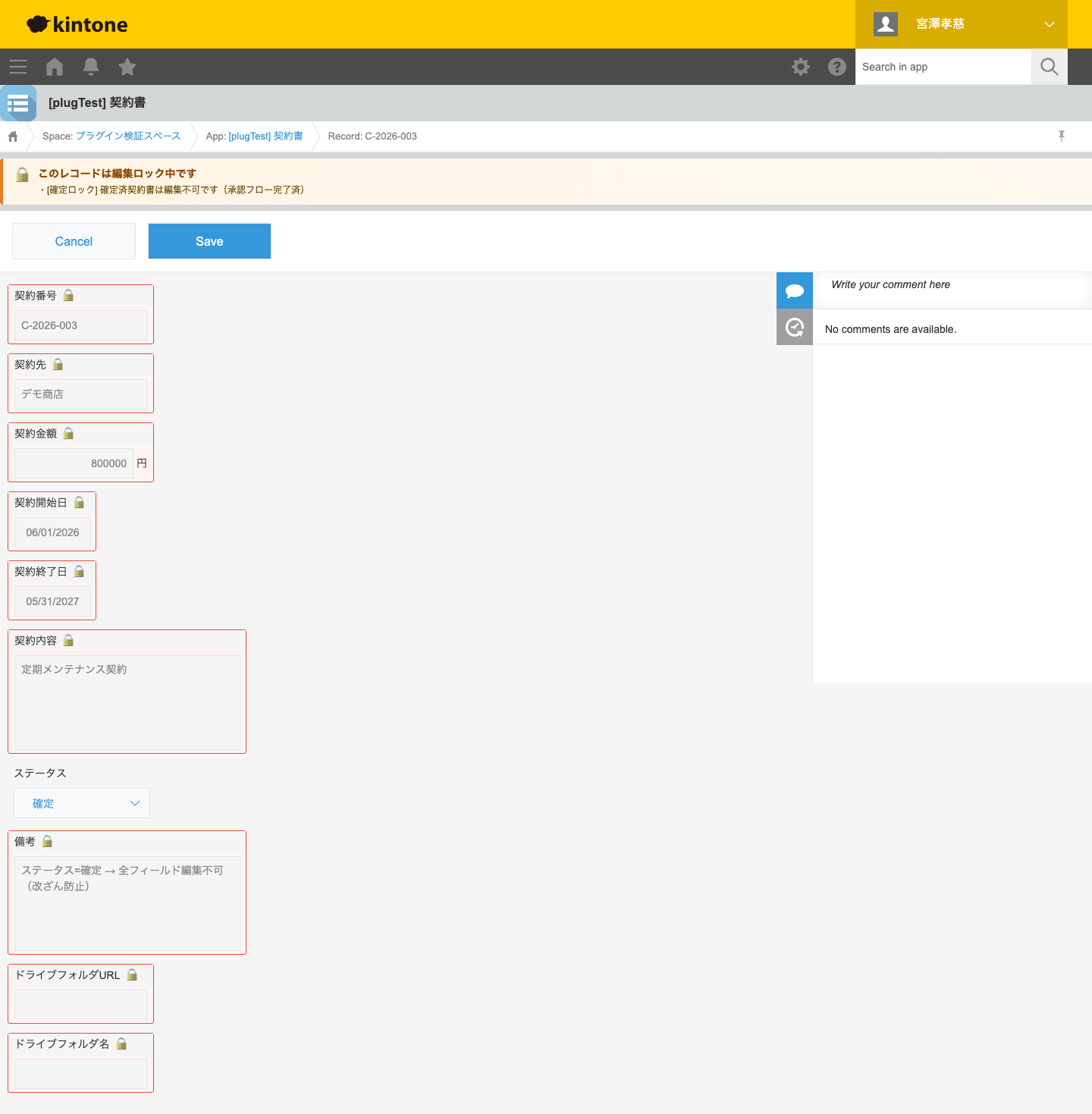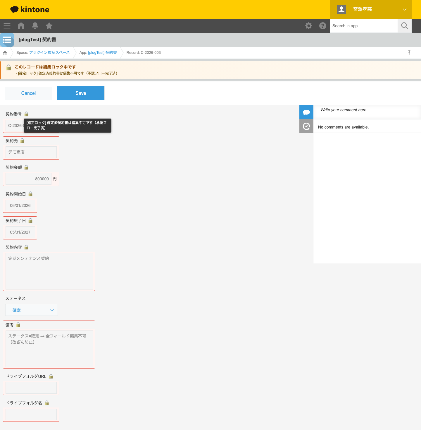 条件が成立したレコードの指定フィールドを編集不可(読み取り専用)にして、改ざんやオペレーションミスを構造的に防ぐ kintone プラグインです。