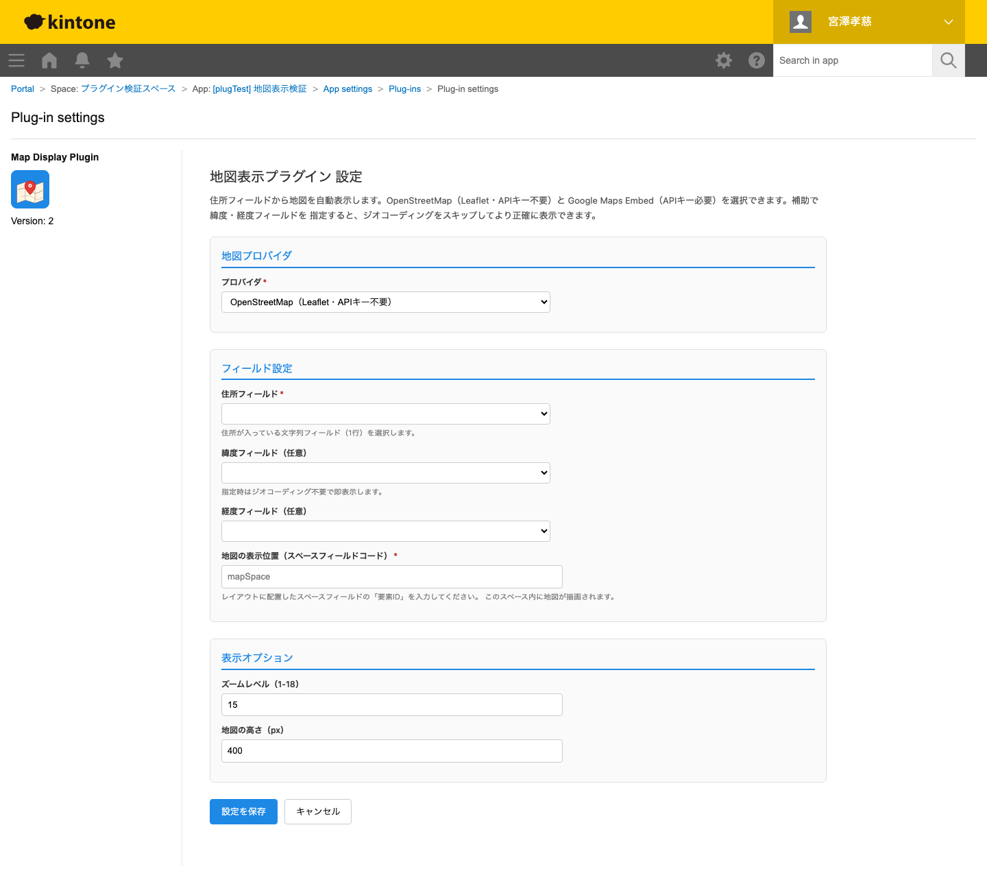 kintone の住所フィールドから地図を自動表示するプラグイン。OpenStreetMap(API キー不要)と Google Maps Embed(API キー必要)に対応。訪問ルート計画・拠点所在地確認・物件情報管理などに活用できます。