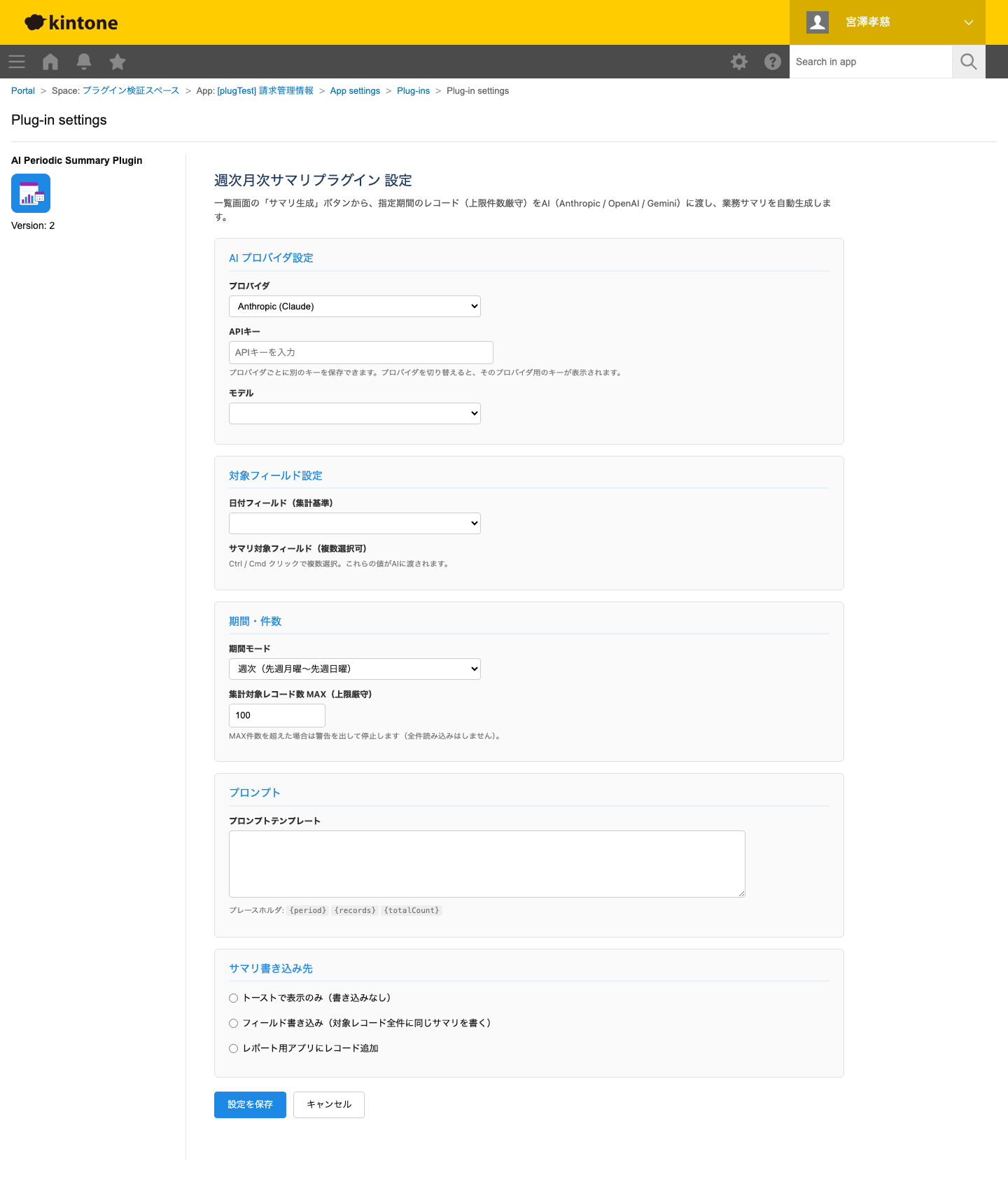 kintone の一覧画面から、指定期間のレコードを Anthropic Claude / OpenAI GPT / Google Gemini に渡して、文章形式の業務サマリを自動生成します。週報・月報作成の工数を大幅削減。