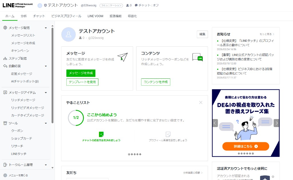 | 初期設定 | LINE公式アカウントの作成 | 1 | – |